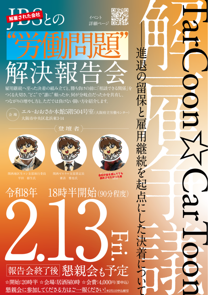 TarCoon☆CarToon(タークゥーン カートゥーン)は、労働組合の関西地区生コン支部 執行委員・平田郁生さん、および関西ゼネラル支部 書記長・兼清雅也さんをお招きし、「労働争議ふりかえり 解決報告会──解雇の留保と雇用継続を起点にした決着について」を、2026年2月13日(金)にエル・おおさかにて開催します。