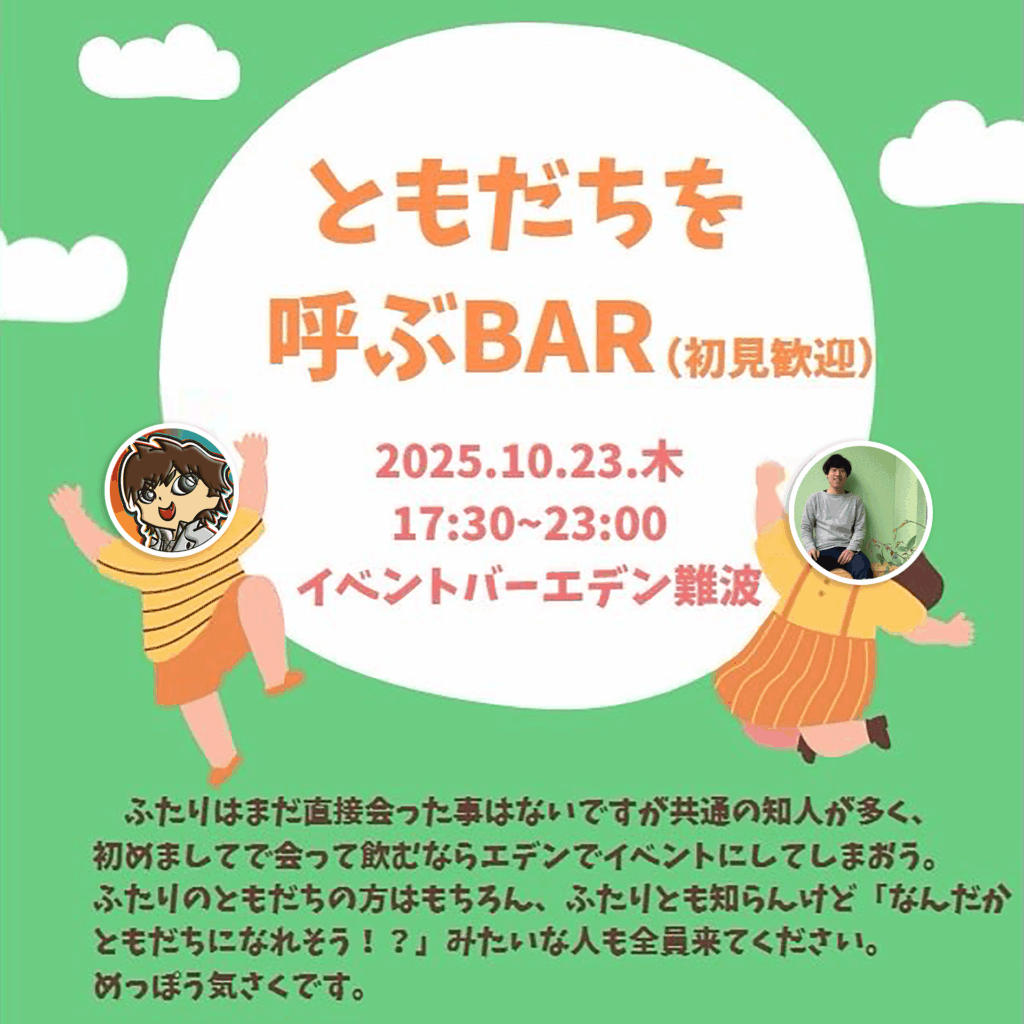 TarCoon☆CarToon(タークゥーン カートゥーン)とくきたふみやのイベントBAR「ともだちを呼ぶBAR」は、2025年10月23日(木)エデン難波にて開催します。両名は直接の面識はありませんが共通の知人が多く、初対面の一杯を“いっそイベントに”という趣旨で、エデン難波のナンノ様のお取り計らいにより実現しました。